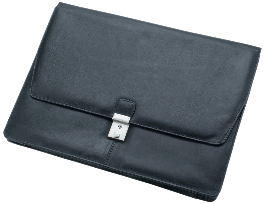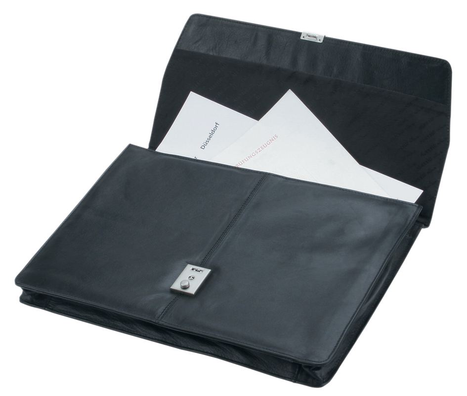 Afsluitbare college map van zwart Nappa leder met groot hoofdvak en metalen sluiting. Afmetingen: 255 x 40 x 342 mm. Productomschrijving in het engels, Productdescription in English Lockable college folder in black Nappa leather with large main compartment and metal closure.