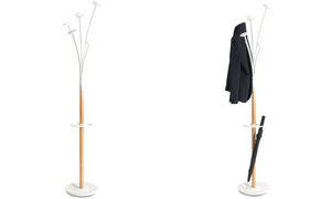 Stylish wooden coat stand ‘FESTIVAL’ with 5 hooks, umbrella holder and stable base. Beech/white design, height: 1870mm.