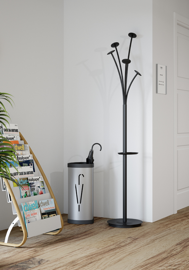 Free-standing coat rack with steel tube (Ø 38 mm) and ABS plastic base (Ø 355 mm). Features 5 hooks and umbrella holder. Weight 5.9 kg.