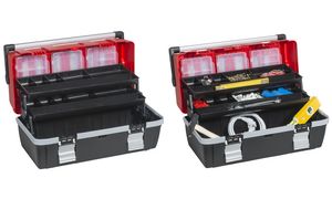 Gereedschapskoffer van polypropylen met 2 uitklapbare tabletten, 3 sorteerboxen en ergonomische aluminium handgreep. Afmetingen: 560x285x280mm. Productomschrijving in het engels, Productdescription in English Tool case with cantilever trays, sorting boxes and aluminum handle.