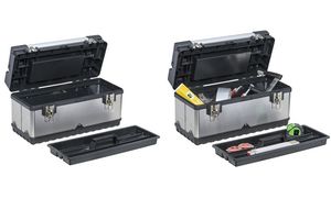 Gereedschapskoffer van edelstaal en kunststof met uitneembare draagbak, 8 uitneembare inzetboxen en stevige aluminium beugel-handgreep. Afmetingen: 505x235x255mm. Productomschrijving in het engels, Productdescription in English Professional tool case with removable tray, 8 insert boxes and aluminum handle.