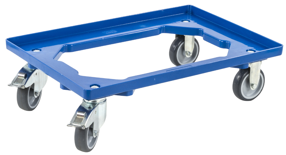 Stabiele kunststof transportroller met 2 zwenk- en 2 remwielen, draagkracht 250 kg, afmetingen 615x415x175mm, verpakt per 2 stuks. Productomschrijving in het engels, Productdescription in English Stable plastic transport dolly with swivel and brake wheels, 250kg capacity, sold in pairs.