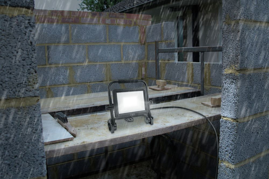 Krachtige 50W LED werkstraler met 5.400 lumen lichtstroom, waterdicht IP65, inclusief 1,8m kabel en Zwitserse stekkeradapter voor professioneel gebruik. Productomschrijving in het engels, Productdescription in English Professional 50W LED work light with 5,400 lumens, IP65 waterproof rating and Swiss plug adapter.