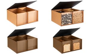 Stijlvolle buffetkist van geolied eikenhout voor het serveren van toast of brood. Met twee compartimenten, kunstleren deksel en uitneembaar acryl venster.