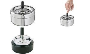 Elegant push-button ashtray with chrome metal body and black rotating lid. Diameter 105mm, height 110mm. Perfect for indoor/outdoor use.