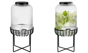 Elegant URBAN beverage dispenser (7L) with glass container, stainless steel tap and metal stand. Includes non-slip mat.