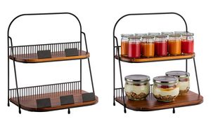 Stijlvolle zwarte etagère met 2 uitneembare planken van acaciahout. Voorzien van anti-slip voetjes en beschrijfschildjes. Ideaal voor buffetpresentaties.