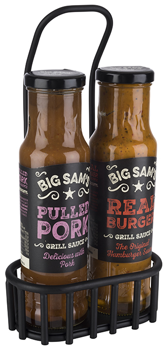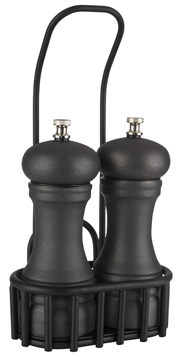 Sleek black metal URBAN spice rack with handle and card holder. Perfect for seasoning bottles or dressings. Size: 130 x 85 x 250 mm.