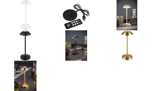 Elegant gold LED table lamp with dimming feature. Rechargeable, waterproof (IP54). Includes charging station and remote control.