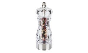 Transparent pepper mill with adjustable steel grinding mechanism, acrylic housing and stainless steel shaft. Diameter 55mm, height 150mm.