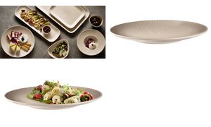 APS NERO plat bord van melamine in zandkleur, diameter 21 cm. Stapelbaar, vaatwasserbestendig en hittebestendig tot 70°C. Hoogte 3 cm.