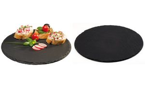 Elegant slate plate in anthracite, 220 mm diameter. Features polished surface, rough-cut edges and furniture-protecting feet. Thickness 6-9 mm.