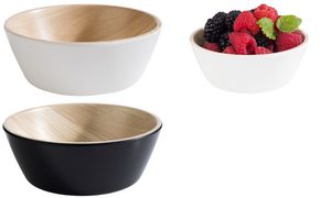 Stijlvol FRIDA schaaltje (0,25L) van melamine met houten binnenkant. Vaatwasserbestendig, compact formaat (Ø125mm) en lichtgewicht.
