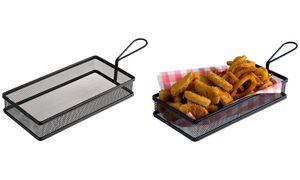 Stijlvolle rechthoekige serveerschaal met fritesmandje van roestvrij staal. Perfect voor presentatie van snacks. Formaat 260 x 130 mm, hoogte 50 mm.