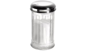 Roestvrij stalen suikerdispenser met glazen reservoir en handige doseerschuif. Diameter 75 mm, hoogte 135 mm. Perfect voor tafelgebruik.