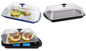 Thermal serving tray set with stainless steel tray, cooling elements, freshness cover and carry strap. Perfect for buffets and catering.