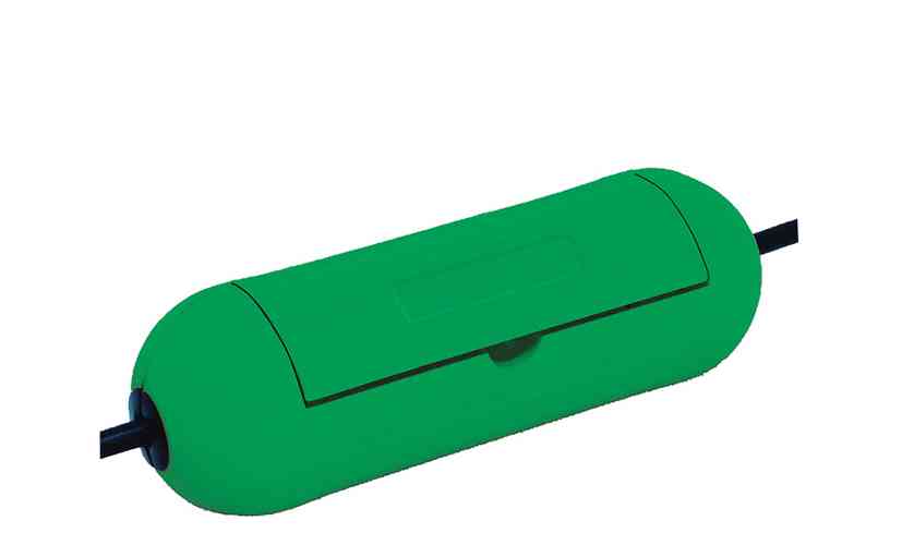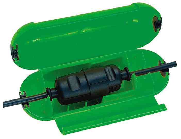 Durable green plastic cable connection box. Provides waterproof and dustproof protection for outdoor cable connections.