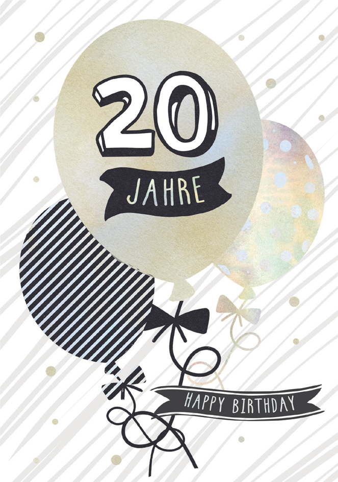 Elegant 20th birthday card featuring hot air balloon design with foil stamping. Size 120 x 170 mm, beige envelope included.