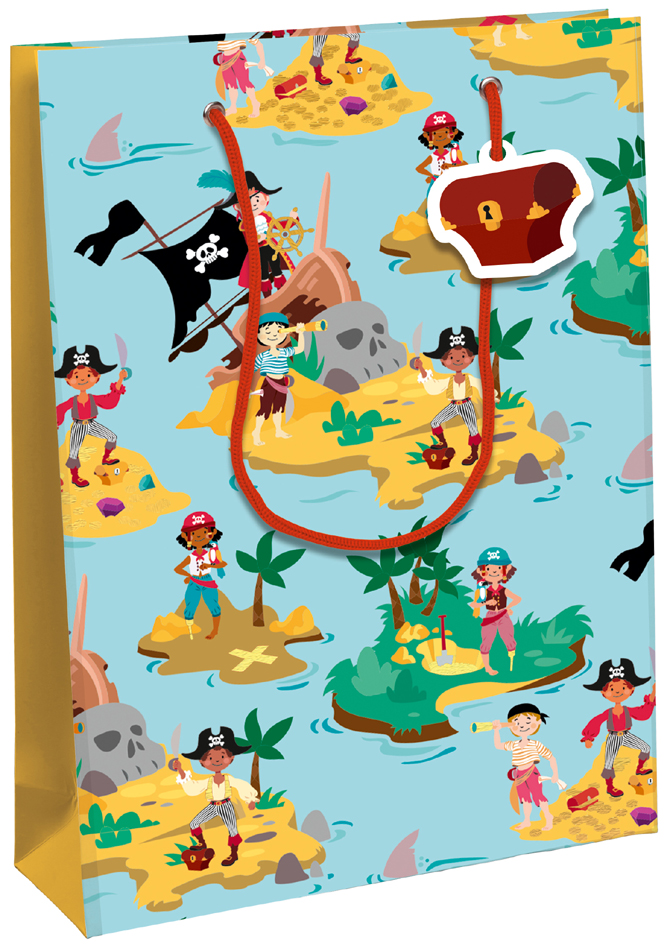 Sturdy pirate-themed gift bag. Coated paper (210 g/m²) with carrying cord. Size: 265 x 140 x 330 mm.