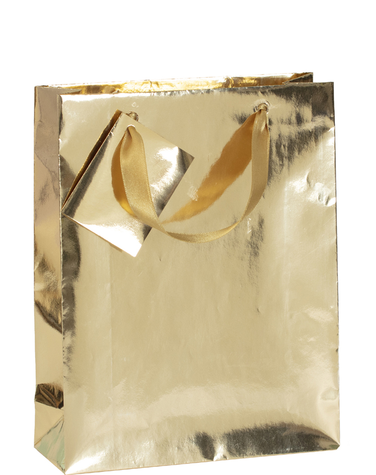 Elegant medium-sized Christmas gift bag ‘Émeraude’ with satin ribbon. Laminated paper, 170 g/m². Dimensions: 170 x 60 x 220 mm.