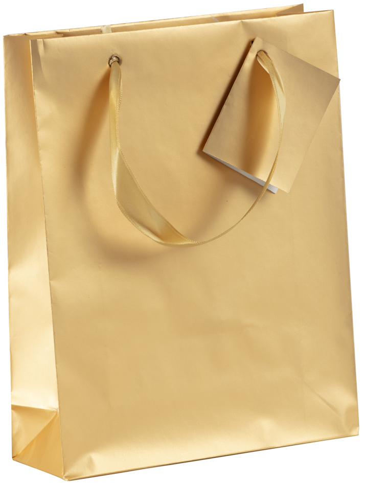 Elegant Christmas gift bag ‘Nuit bleutée’ with PP-coating, golden satin ribbon. Premium 170 g/m² paper. Size: 170 x 60 x 220 mm.