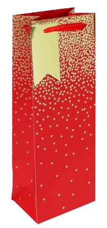 Elegant red bottle gift bag with star pattern. Coated paper (210 g/m²), satin ribbon. Size: 127 x 90 x 355 mm.