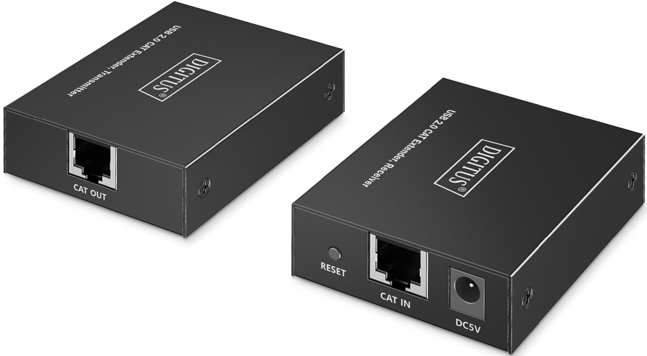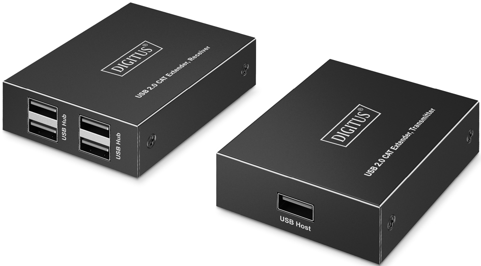 DIGITUS USB 2.0 Verlenger met 4 poorten. Verzendt USB-signalen tot 150 meter via netwerkkabel (Cat.6, niet meegeleverd). Ondersteunt overdracht tot 480 Mbps.