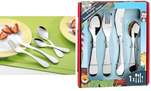 4-delig kinderbestek van hoogglanzend roestvrij staal met gegolfde mesrand. Vaatwasserbestendig. Bevat mes, vork, lepel en koffielepel. Productomschrijving in het engels, Productdescription in English 4-piece children’s cutlery set, stainless steel, dishwasher safe, includes knife, fork, spoon and coffee spoon.