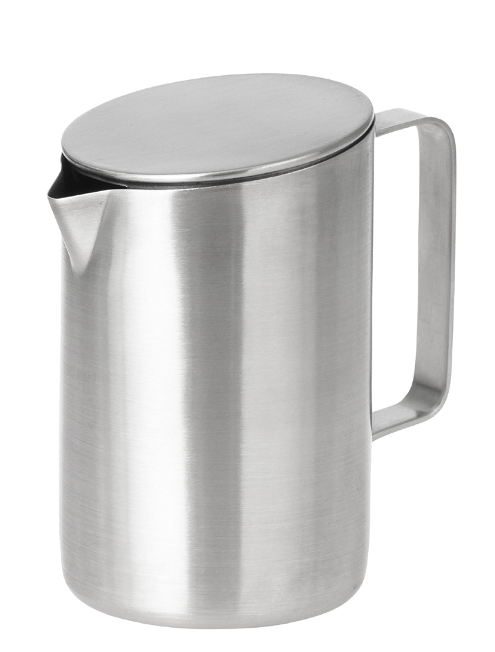 Melkkannetje van geborsteld roestvrijstaal 18/10 met deksel. Hoogte 100mm, diameter 62mm. Vaatwasmachinebestendig voor dagelijks gebruik. Productomschrijving in het engels, Productdescription in English Brushed stainless steel milk jug with lid, dishwasher safe, 100mm height.