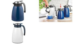 Dubbelwandige RVS thermoskan, onbreekbaar, eenhandsbediening, houdt 8 uur warm/koud, glanzend gelakte afwerking, grote opening. Productomschrijving in het engels, Productdescription in English Double-wall stainless steel thermal carafe, unbreakable, one-hand operation, keeps hot/cold 8 hours.