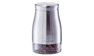 Stijlvolle voorraadbus voor koffie van roestvrij staal en glas. Inhoud 1,3 liter, hoogte 19 cm. Met schroefdeksel voor optimale versheid.