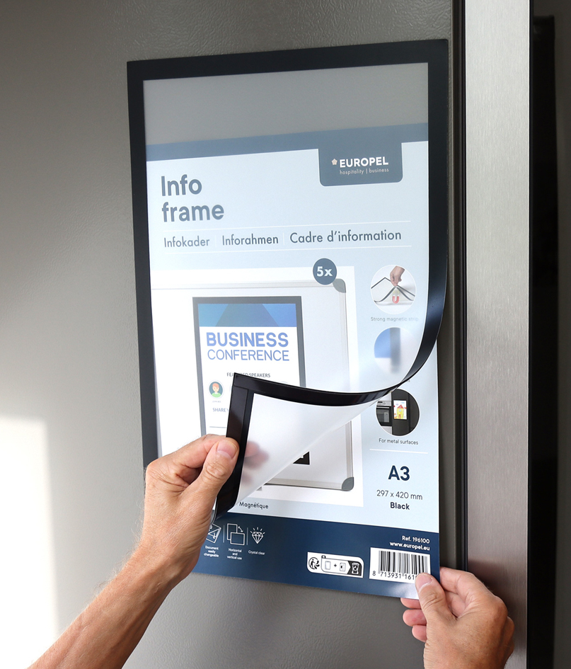 Set of 5 magnetic information frames made of polypropylene with scratch-resistant transparent front. Adhere to metal surfaces, easy repositioning for flexible presentations.