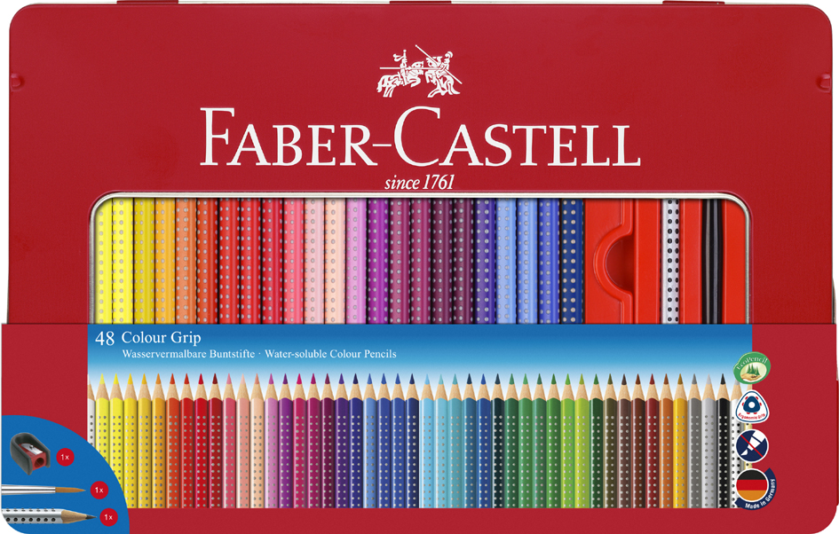 Set of 48 triangular color pencils with ergonomic grip. Water-blendable. Includes brush, pencil and sharpener in metal case.