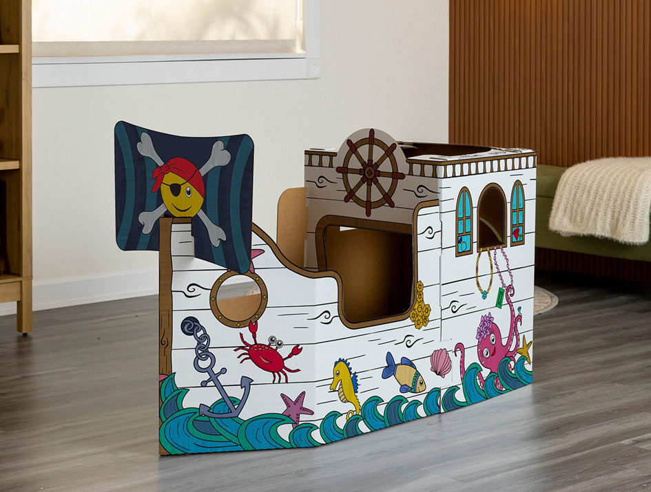 Sturdy play cardboard pirate ship with rounded edges and pre-printed designs. Quick assembly without glue, openable doors and windows, recyclable. Dimensions when assembled: 505 x 790 x 1,350 mm.
