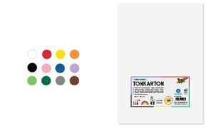 Hoogwaardig gekleurd karton in 12 kleuren: hoogrood, bananengeel, oker, lila, oudroze, koningsblauw, middengroen, dennegroen, wit, steengrijs, zwart en chocoladebruin. Doorgekleurd, zuurvrij, uitstekende absorptie en stevigheid. 120 vellen totaal.