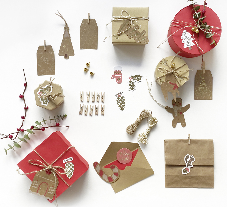 Complete verpakkingsset met 12 cadeaulabels, 12 stickers, jute- en bakkerkoord, houten knijpers en gouden belletjes. Perfect voor stijlvolle cadeauverpakking. Productomschrijving in het engels, Productdescription in English Complete gift wrapping set with tags, stickers, cords, wooden clips and golden bells for stylish packaging.