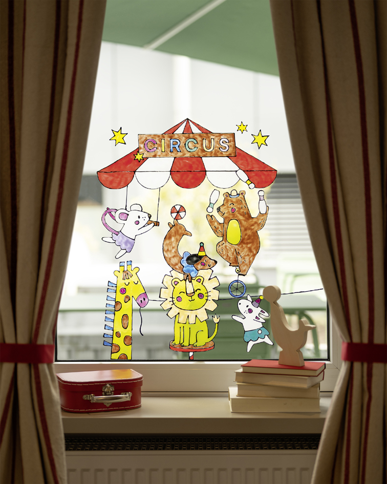 Set includes 10 bottles of 80 ml in various colors plus black contour paint. Complete with circus tent poster template and stencils for creative window decoration.