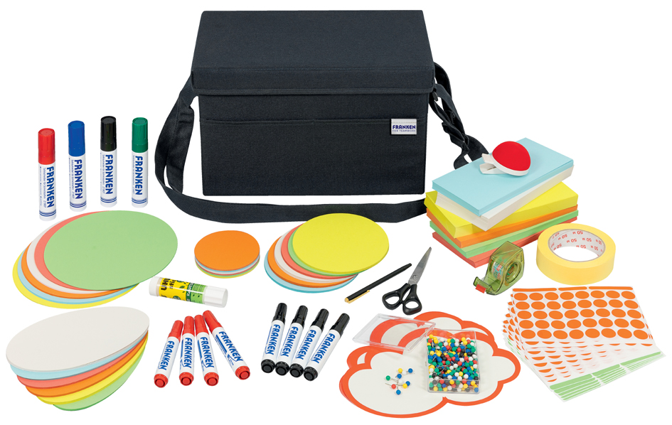 Complete moderatieset met moderatiewolken, geometrische vormen, markeerstiften, bevestigingsmaterialen en presentatieaccessoires voor workshops en vergaderingen. Productomschrijving in het engels, Productdescription in English Complete moderation kit with cards, markers, adhesive materials and presentation accessories for workshops.