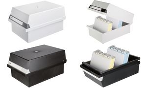 Kaartenbak van polystyrol voor 800 A5 kaarten, inclusief steunplaat en verschuifbare tab. Met rubberen voetjes en beschriftingsveld. Afmetingen: 234x248x180mm. Productomschrijving in het engels, Productdescription in English Card index box for 800 A5 cards, polystyrene construction with support plate and sliding tab included.