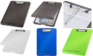 Functional white A4 clipboard with storage compartment, waterproof inner pocket, pen holder and metal clip. Perfect for mobile use.