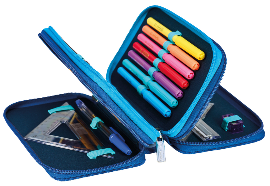 Polyester etui met drie compartimenten en ritsen, compleet gevuld met 31 schoolbenodigdheden zoals pennen, potloden, liniaal en gum. Productomschrijving in het engels, Productdescription in English Three-compartment polyester pencil case filled with 31 school supplies including pens, pencils, ruler and eraser.