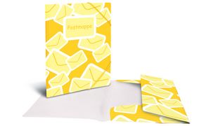 Bedrukte verzamelmap van polypropeen met elastieksluiting. A4 formaat met opdruk ‘Postmappe’ op voorkant voor georganiseerde documentopslag. Productomschrijving in het engels, Productdescription in English Printed A4 document folder with elastic closure, yellow polypropylene material for organized mail storage.