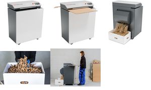 Cardboard shredder that transforms boxes into protective packaging chips. Processes up to 3 layers at 10m/min, ideal for sustainable packaging.