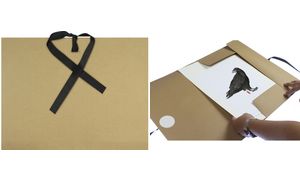 Stevige tekenmap van kraftkarton (500 g/m²) met 3 inslag kleppen en zwarte lintsluiting. Ideaal voor tekeningen tot 50×70 cm. Productomschrijving in het engels, Productdescription in English Sturdy kraft cardboard drawing portfolio with flaps and ribbon closure for 50x70cm drawings.