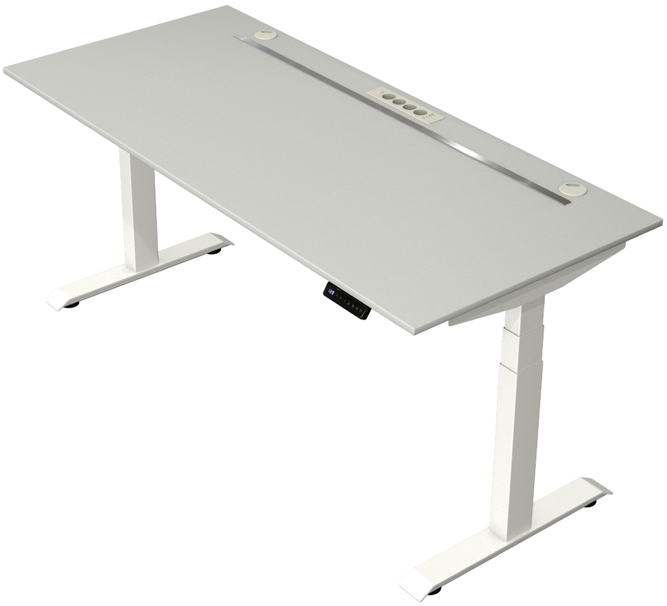 Electric height-adjustable sit-stand desk (180x80cm) with white T-base, light grey desktop, integrated power strip and memory function.