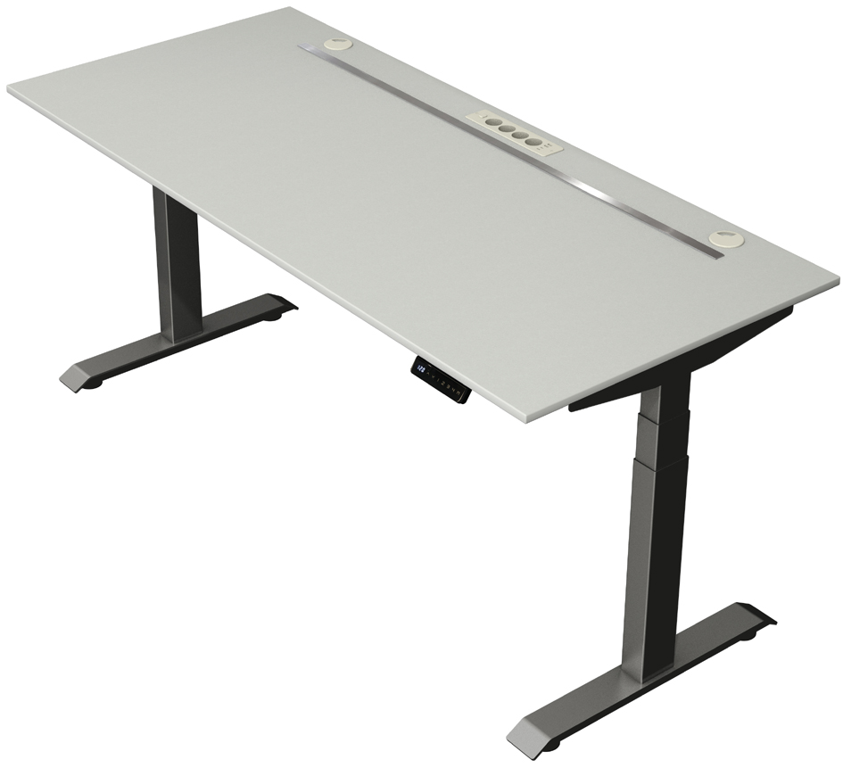Electric height-adjustable desk (180x80cm) with integrated power strip, memory function and anthracite T-base. Height range: 64-129cm.