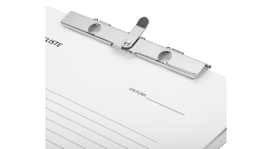 **Aluminium formulierenhouder A4 met zijwaartse opening en beschermklep voor vertrouwelijke documenten. Stevige klem voor veilig vasthouden. Afmetingen: 230 x 320 x 28 mm.**