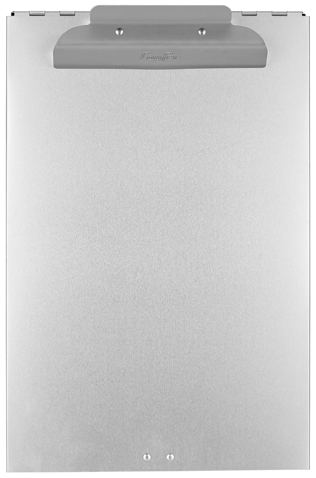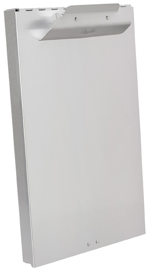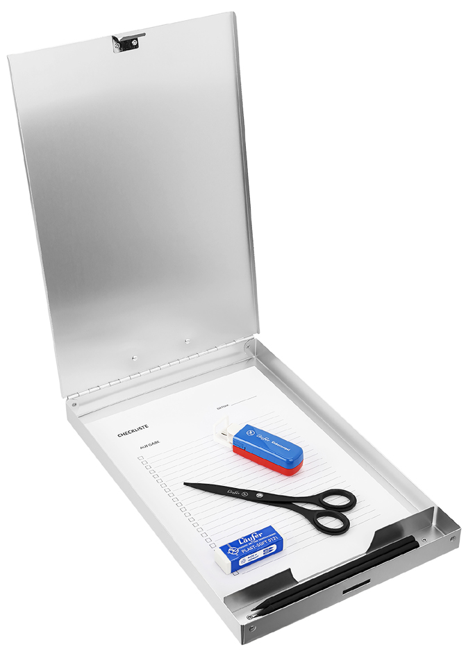 Stevige aluminium formulierhouder A4 met klemmechanisme, opbergvak en handige opbergruimte voor schrijfgerei. Afmetingen: 235 x 350 x 30 mm.