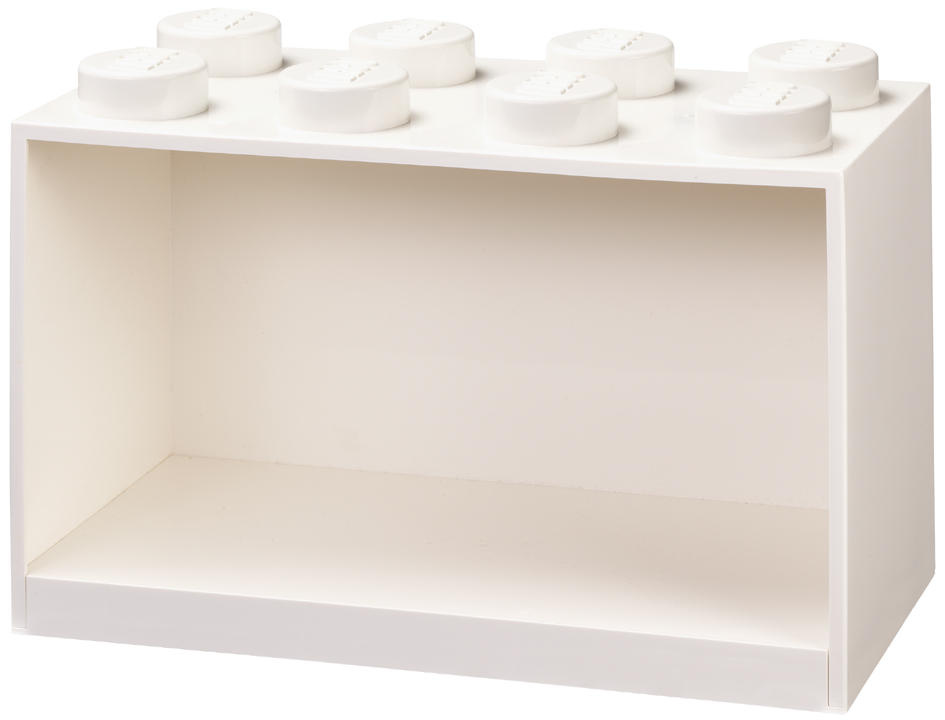 LEGO Brick Shelf 8: stapelbaar wandrek van ABS-kunststof. Ideaal voor boeken of decoratie. Monteerbaar aan muur of plaatsbaar op meubels. Afmetingen: 318×159×211mm.