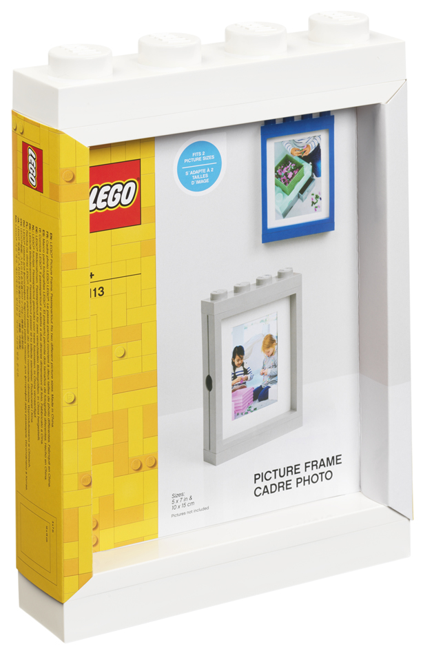White LEGO picture frame with 4 studs, fits 10×15 cm photos. Wall-mountable or freestanding. Compatible with minifigure displays.